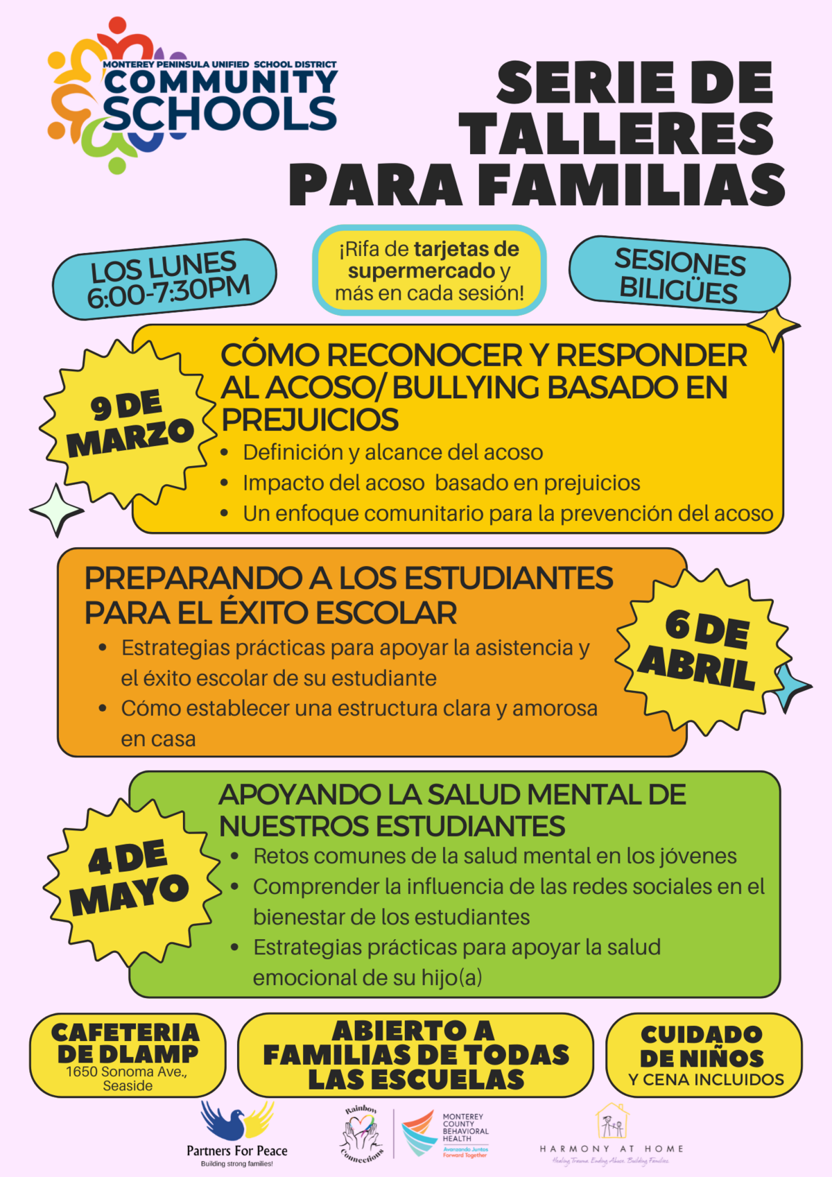 We invite all families in MPUSD to attend this monthly series - first one is this evening - March 9, 2026, from 6 - 7:30 p.m. at the Dual Language Academy of the Monterey Peninsula located at 1650 Sonoma Avenue in Seaside. In English and Spanish.